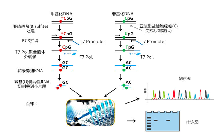 DNA甲基化存在于大多數(shù)真核生物中,一般發(fā)生在CpG雙核苷酸中胞嘧啶的5’UTR區(qū),起調(diào)控作用。CpG的胞嘧啶大概有80%被甲基化,20%處于基 因調(diào)控區(qū)的CpG島中。BSP甲基化測(cè)序(Bisulfite Genomic Sequencing PCR)的原理通過對(duì)基因組DNA進(jìn)行重亞硫酸鹽處理,非甲基化的胞嘧啶被脫氨基而轉(zhuǎn)變成尿嘧啶,在隨后的PCR反應(yīng)中尿嘧啶轉(zhuǎn)變成胸腺嘧啶,而甲基化的胞嘧啶不能被脫氨基,在反應(yīng)完成時(shí)被保留,我們將擴(kuò)增得到的PCR產(chǎn)物進(jìn)行TA克隆測(cè)序,可以分析甲基化發(fā)生的具體情況。該方法實(shí)驗(yàn)結(jié)果準(zhǔn)確性高,是甲基化檢測(cè)的金標(biāo)準(zhǔn)。